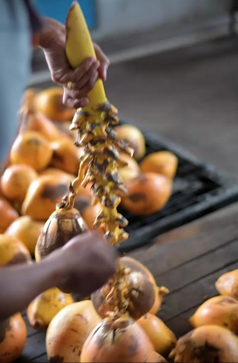 Zunächst werden die King Kokosnüsse von unserem Partner in Sri Lanka aus Bio Homegardens geerntet. Unmittelbar nach der Ernte wird das Kokoswasser aus den frischen Kokosnüssen gewonnen und behutsam erhitzt. Dieser Erhitzungsprozess dient dazu, die Haltbarkeit zu verlängern, ohne die wertvollen Nährstoffe und den natürlichen Geschmack zu beeinträchtigen.